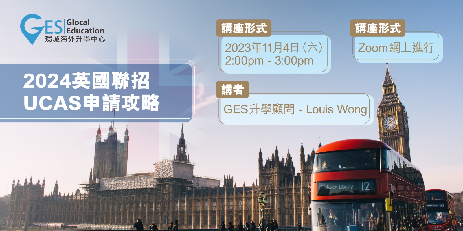 GES將於11月4日舉行【2024英國聯招申請攻略】網上講座,為應屆HKDSE學生及家長詳細分析英國UCAS聯招的申請程序,選校策略,以及教授學生如何寫一篇能夠引人入勝的個人陳述書(Personal Statement),從而提高錄取機會!